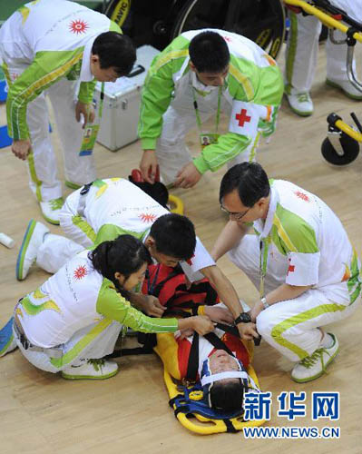11月16日,中国选手汤科蓉在比赛中摔倒受伤后被抬上担架,随后她因伤退出比赛。当日,第16届亚运会场地自行车女子计分赛发生了严重的车辆相撞导致车手摔倒的事故,几名选手因伤退出比赛。新华社记者李尕摄