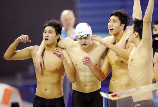 昨晚游泳比赛的最后一项是男子4×200米自由泳接力,张琳、蒋海琦、李昀琦、孙杨代表中国队向金牌发起冲击。4年前的多哈亚运会,他们惜败于日本队。广州亚运会前,张琳和孙杨就多次表示:最希望夺得这枚团体金牌。从第一届起,日本队就一直是这项比赛的冠军———14连冠,保持了56年之久的垄断优势。中国队自参加亚运会以来,只拿过7次亚军。