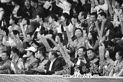 前天上午9时,优秀农民工代表们启程前往世纪莲体育中心,9时40分,距离花样游泳集体技术自选预赛开始还有20分钟,陈云贤、周天明和30名农民工代表来到观众席就坐。这时,陈云贤还饶有兴趣地拿起座椅上的充气棒吹起来,一个不过瘾,再来一个,结果副市长麦洁华和胡小燕两人的加油棒都是由书记一人吹起来的。每支队伍表演完毕,陈云贤都带头鼓掌,尤其是在得知中国代表队取得整场比赛第一名时,陈云贤挥动着手中的充气棒,一边欢呼,一边叫好,带动周边的农民工代表也跟着欢呼起来。