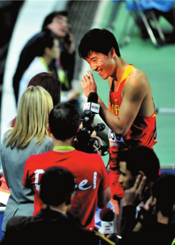 刘翔预赛轻松获得第一名,赛后受访自然眉开眼笑。