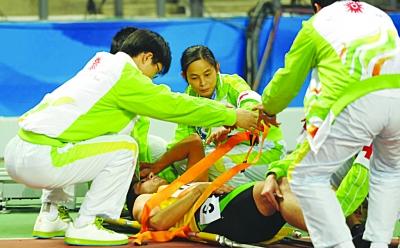 23日晚,广州亚运会田径比赛进入第三日争夺,在男子4×400预赛中,伊朗选手阿汉加里因发力过猛,接力棒打在了“要害部位”,随后被送往医院救治。木 易