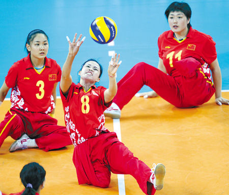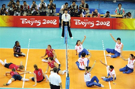 残奥会坐式排球比赛方式与奥运会排球比赛方式基本相同,但有部分特殊规定:例如坐式排球的比赛场地小于6人排球比赛场地;在比赛过程中运动员需坐在地上进行比赛,其臀部必须保持与地面接触,不允许站立和行走;在没有妨碍对方完成技术动作的情况下,允许队员的手和脚越过中线;防守队员可以直接拦截发球等。(来源: 亚残运会官方网站)
