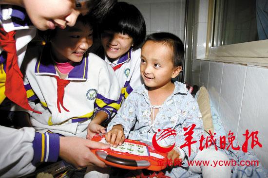 6岁的小华琛坐在儿童医院的病床上,双脚打着石膏———这是他第三次打石膏做矫正。他从小失去父母,又患有先天性马蹄内翻足,性格内向。不过,来广州近一个月的日子,他不断被热心人改变着。1日,广州市第13中学8名学生代表也来到儿童医院探望小华琛(见右图)。