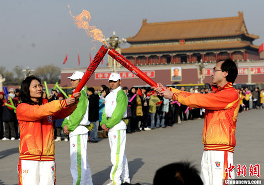 10时21分,中共中央政治局委员、广东省委书记汪洋用在北京中华世纪坛采集的圣火火种,点燃了火种盆。习近平神情庄重,从火种盘点燃火炬,然后高高举起火炬,向人们展示。