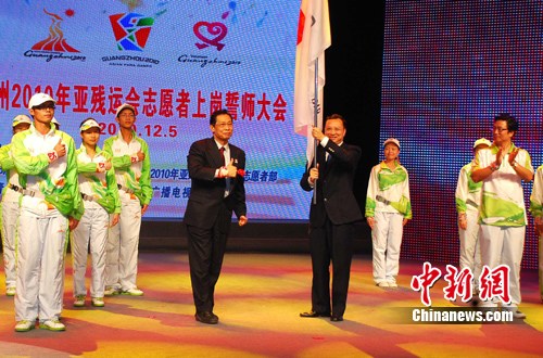 5日下午,“当好亚残东道主 志愿创造新生活”——亚残运会志愿者誓师大会在广州珠江新城举行。会上,亚运会、亚残运会志愿者进行志愿者旗帜交接和集体换彩仪式,标志着亚运志愿服务正式转入“亚残运时间”。“志愿者服务旗帜”从亚运志愿者形象大使钟南山(左2)向亚残运志愿者形象大使白岩松(右1)交接。