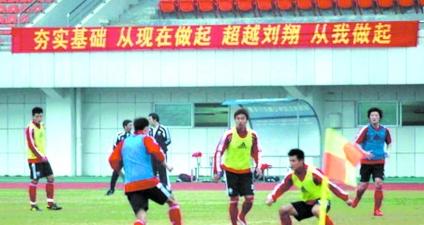 国足正在海口备战明年1月6日开幕的卡塔尔亚洲杯,每天的训练内容是上午在海边有氧跑步训练体能,下午在球场上练习技战术,晚上进行力量训练。每天下午的训练在海南省运动技术学校进行,重点是一些小技术强化训练和小场地对抗,很少战术内容。但在球场内,真正吸引人的却是看台上“夯实基础,从现在做起;赶超刘翔,从我做起”的标语,据了解,这是该校为田径运动员准备的,国足恰好“借用”。不过,刘翔的卧薪尝胆、东山再起,与国足的现状多少也有些异曲同工之处,但愿不要辜负了这个巧合。