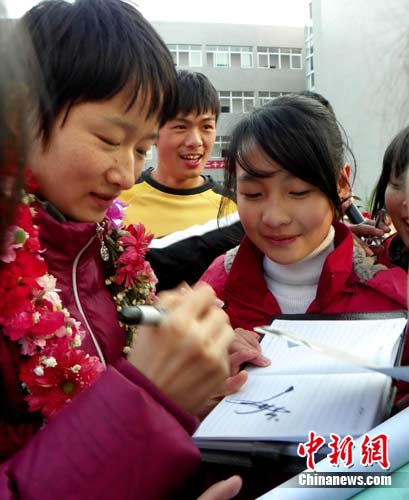当天下午4时左右,吴静钰身着红色大棉袄来到母校景德镇市体校,受到全校师生的热烈欢迎,大批学生拿着纸和笔向她索要签名,吴静钰都一一予以满足。随后,景德镇市还为她举行了欢迎仪式并颁发了3万元奖金。