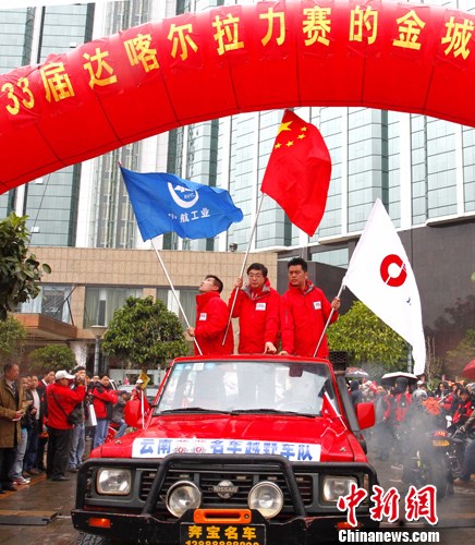 中国金城摩托车队征战第33届达喀尔拉力赛出征仪式12月11日在昆明举行,作为我国唯一一支摩托车队正式参加将于2011年1月1日至16日在阿根廷和智利举行9000多公里的比赛,中国著名越野摩托车手苏文敏(右)、车队领队隋全武(中)、和队友韩宝华在出征仪式上。 赵振清 摄