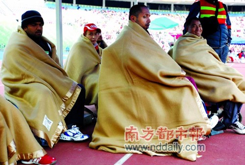 寒风清冽,低温袭来,面对广州忽如而至的大幅降温,参加广州亚残会的运动员们在比赛间隙各出妙招保暖,有的裹上毛毯,有的延长热身,有的自制暖水袋……