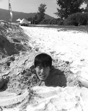 一大早,刘翔起床到海边,心情甚好的他戴上酷酷的彩色墨镜,把T恤搭在脖子上当围巾。沙滩上,调皮的刘翔三刨两抓就给自己掏了一个“埋身坑”,之后叫同行者将沙子慢慢地覆盖在身上。不一会,刘翔就被“活埋”了!沙滩上的沙子长时间受到暴晒,温度非常高。在沙包里“埋”了没一会,刘翔就举双手求饶,这才在别人的帮助下,逃出沙坑。