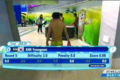 网友“竹蜻蜓”说:“仁川亚运会男子跳水比赛上,韩国选手采用最新动作蛙式跳水:蛙式降落下体率先入水。对于这一高难度姿势,裁判团思量再三不约而同给出了0分!”
