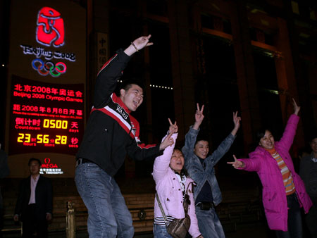 中新网3月27日电 “十、九、八、七……四、三、二、一,”昨晚,在几百名群众的倒数声和欢呼声中,矗立在北京天安门广场东侧、中国国家博物馆前的北京2008年奥运会倒计时牌上显示出“500天”的字样,这也告诉我们,现在距离北京2008年奥运会只有五百天的时间了。