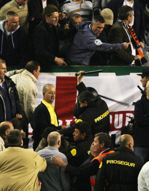 比赛刚开始2分钟,热刺队就反客为主由基恩攻陷了塞维利亚的城门,但热刺的领先优势仅仅持续了十多分钟就被对方前锋卡努特以一记富有争议的点球化为乌有。而正是这粒点球成了引发球迷冲突的导火索。看台上的热刺球迷因不满裁判判罚而愤怒地拆下塑料椅子掷向防暴警察,而对方则回应以雨点般的警棍,最终球迷骚乱被迅速平息。据英国独立电视台赛后报道称,冲突中有8人被送往医院,其中7人为热刺球迷,另有一名警员,伤者的伤势包括刀伤、擦伤,另有一人手腕骨折。