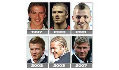 这十多年以来,小贝已经换了10多个发型,每次都能引起媒体和公众的巨大关注和评论,放眼世界足坛,绝对是“时尚第一人”。而在这些发型中有很多是值得回忆的,比如在出道时,小贝的长发金色柔顺,而且还有刘海儿,充满着青春活力;到2000年当父亲时,小贝理的光头引起巨大称赞,甚至吸引不少球星剪掉青丝。而在2001年,小贝的莫西干头则透着叛逆精神,这是模仿罗伯特·德尼罗在热门影片《出租车司机》里扮演的比克尔的发型,结果引来巨大争议。而现在小贝的新发型相对来说也颇值得玩味,只是不知道他是否很快又会改变发型。