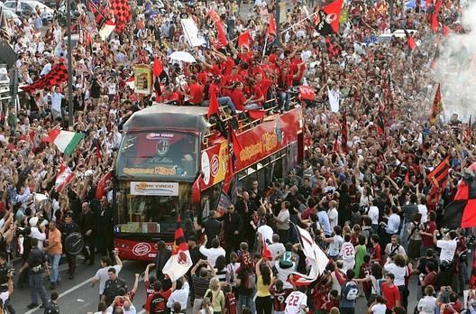 俱乐部主席贝卢斯科尼为米兰举行通宵派对,该队从雅典飞回后,稍早在Malpensa机场已经有一波球迷欢迎他们。在进行了一番休整后,球员们乘坐一辆敞篷巴士环游全城,巴士在米兰大教堂广场拥挤的人群中艰难地前进。狂喜的球迷们头天晚上在大屏幕上看完雅典决赛后,还曾在这儿庆祝。