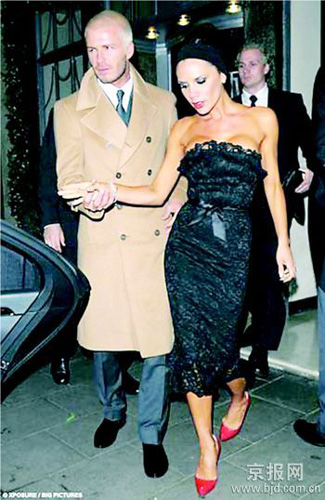 夫唱妇随,维多利亚的穿着打扮也同样的老气横生。当晚维多利亚穿了一件镶嵌蕾丝边的连衣裙,腰间别了个蝴蝶结,头发盘起,头上戴着黑色头箍,脸上的妆依旧画得很浓,还穿了双红色高跟鞋。不知道是擦得粉太重,还是新年活动过于忙碌而体力透支,镁光灯下的“辣妹”一脸惨白形像老态。英媒体讽刺这身打扮超出了她33岁的年龄,看起来简直可与丑剧大师马塞欧比肩。(记者刘大伟)