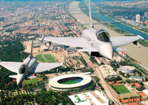 奥地利空军为确保欧洲杯期间主赛场的安全,派出最新装备的EF2000“阵风”式战斗机执行空中巡逻任务,以确保比赛的安全。