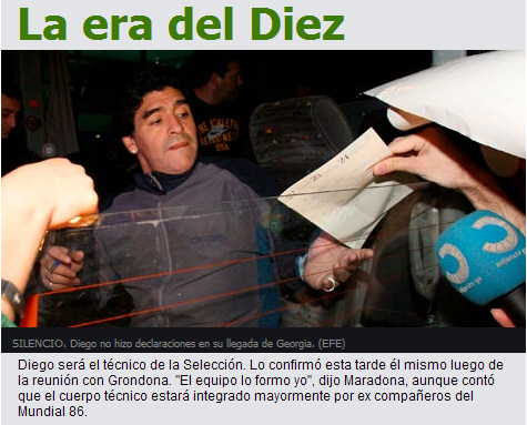 《奥莱报》以“10号的时代”为标题,第一时间发表了这条消息。阿根廷时间10月28日下午,马拉多纳在和格隆多纳面谈后确定了自己将成为新的国家队主教练。他说:“我将自己组建球队。”同时他还表示,教练组将以他86年世界杯夺冠时的球队成员为主,甚至当时的冠军主帅比拉尔多也有可能再度出山,辅佐爱徒。