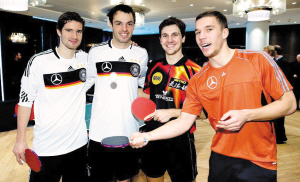 拿着乒乓球拍的波多尔斯基(右一)表情搞怪,波尔(右二)在一众高人面前显得有点矮小。