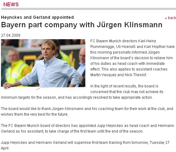 拜仁慕尼黑队的声明说,拜仁的主管鲁梅尼格等高管27日一早已经通知了克林斯曼,俱乐部管理层已经决定将其解职,该解职令即刻生效。同时被解雇的,还有克林斯曼的助理教练巴斯克斯(Martin Vasquez )以及特斯洛夫(Nick Theslof)。