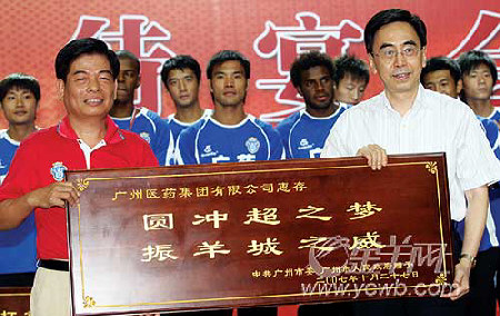广药队冲超成功,广州市政府重奖300万元!昨(27日)晚,广州市人民政府在白云国际会议中心为广药队举行盛大的庆功会。会上,广州市副市长许瑞生代表市政府向广药队颁发300万元。