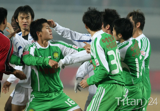 11月12日,北京国安与天津泰达赛后,双方爆发斗殴,黄博文(16号)与对方殴打。图片来源:体坛网