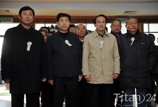 中国足协副主席谢亚龙、张吉龙、南勇出席足坛元老马克坚追悼会。 图片来源:体坛网