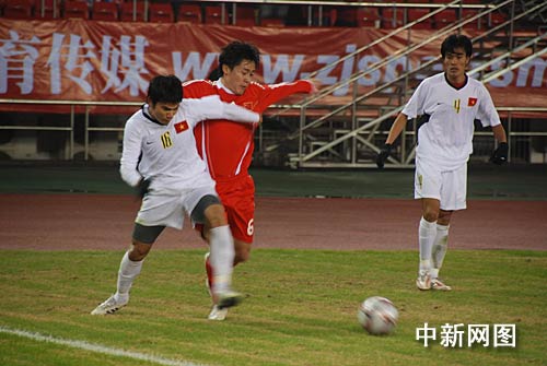 不过国足并没有被突如其来的丢球打乱阵脚,第20分钟凭借姜宁的妙传造成郜林单刀,这次他把握住了机会低射命中,将比分改写为2-1。7分钟后,中国队获得角球机会,吴昊争顶漏过皮球,杜威迎球怒射破门,将比分扩大为3-1。第37分钟,国足发动攻势被越南队后卫破坏,姜宁在禁区前沿拿球后大力抽射,皮球洞穿了客队大门。上半场比赛结束时,国足就以4-1大比分领先。