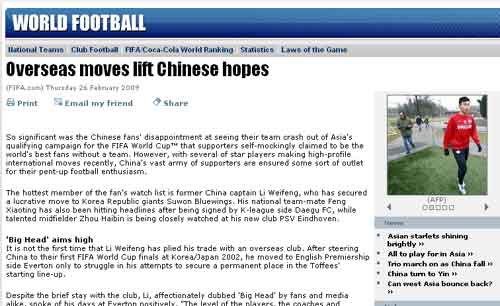 国际足联官方网站昨天以《海外球员重燃中国足球希望》为题,对中国足坛新一代“留洋潮”进行了报道。文章称,自国足无缘南非世界杯之后,中国球迷们承受了巨大的失望。他们自嘲是“世界上最好的球迷”,但没有匹配的球队。然而,随着几名球员最近再度走出国门,中国球迷们的热情再度被调动。