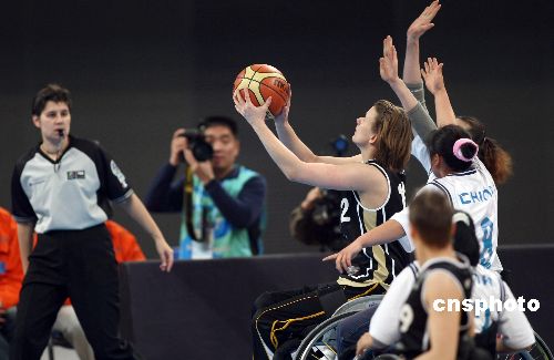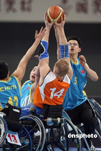 国际轮椅篮球邀请赛中国男队无力阻挡荷兰男队进攻。