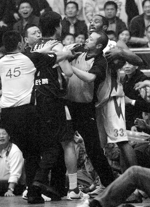 最后时刻,哈里斯(右一)与王世鹏(左二)差点拳脚相向,幸好被裁判拉开。