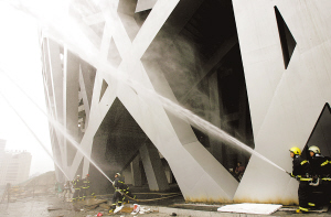 数分钟后,奥林匹克中心区消防站驶达事故现场,确定最佳进攻路线后,一台五十铃泡沫消防车轰鸣着通过鸟巢外环形通道,进入场内东北角,从东北侧观众台铺设水带,直到观众台最上端的三支水枪同时喷发出水龙。内外夹攻下,场内“火势”很快被控制了,闷热天气下的鸟巢被浇了个“透心凉”。“今天的演习主要是让施工人员熟悉消防部门目前制定的应急预案。”李进说。