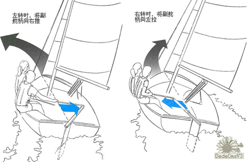 若想让帆船向某个方向运动,您只需要在相反的方向推拉舵柄即可。移动舵柄向右,则船左转,移动舵柄向左,则船向右转。转向风的方向有时称为向上风,转离风的方向有时称为向下风。 驾驶时,舵手的双手应握在一起,并不时地观察帆和船前波浪和风的情况,也不要忘了在帆杆下观察从下风向到来的船只。 你可能只想用舵柄在驾驶,但是副舵柄可以让你坐得更靠甲板外。