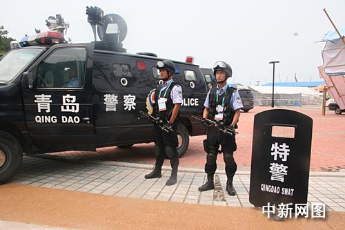 除了对进出的观众进行安全检查,青岛奥帆委此次还动用了特警,为比赛保驾护航。