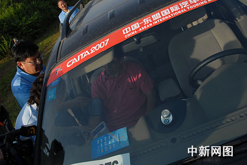 在车队行驶到老挝境内时,17号车的车手突感身体不适,随队医生迅速对其进行检查,该车手有些低血糖症状,并无大碍,应该不会影响接下来的比赛。王红纲 摄