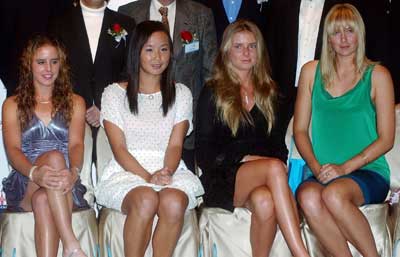 香港网球精英赛昨天在维多利亚公园中央场拉开战幕。在前晚的赛前酒会上,彭帅和莎拉波娃等人坐到了一起,争奇斗艳。(左起:彭帅、汉图楚娃、莎娃)