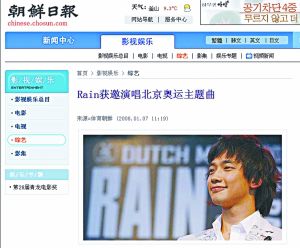 昨日,《朝鲜日报》的中文网站上,还有此报道。报道没有透露消息来源。称Rain“欣然接受了邀请,正与北京奥委会(应为北京奥组委)面谈”。