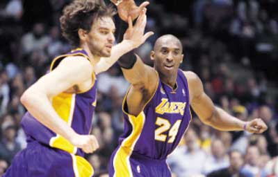 昨天,湖人客场迎战篮网,这是加索尔首度代表湖人出战,尽管开局略有点紧张,但整场比赛加索尔贡献24分、12个篮板、4次助攻,最终湖人105∶90大胜篮网。科比由于在比赛中手指受伤只拿到6分,不过他的心情显然因为加索尔的出色发挥变得很好。
