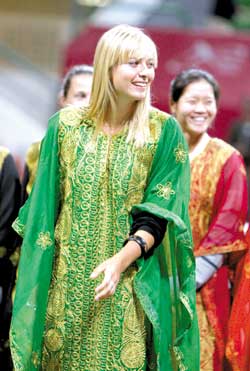 昨天WTA一级赛卡塔尔公开赛开赛仪式上,参赛女选手身着卡塔尔民族服装亮相,莎娃在其中更是亮丽出众。