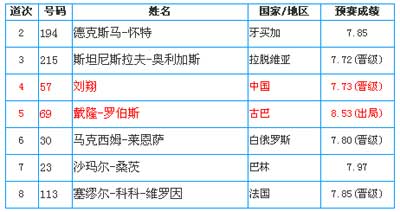 道次上,刘翔被分在第4道,该小组共有7名选手,第1道没有选手参赛,旁边的第5道就是最大竞争对手古巴名将罗伯斯(Dayron Robles)。第2道是牙买加选手德克斯马-怀特,第3道也是牙买加选手斯坦尼斯拉夫-奥利加斯。分列6、7、8道的是白俄罗斯选手马克西姆-莱恩萨、巴林选手沙玛尔-桑茨和法国选手塞缪尔-科科-维罗因。