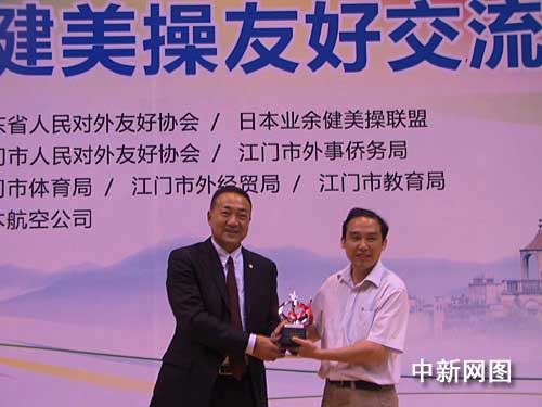 图为江门市政府与日本业余健美操联盟交换纪念品。