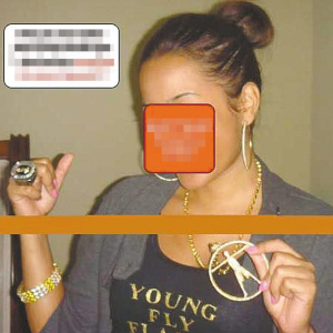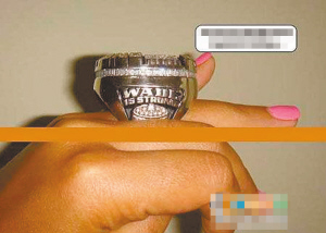 NBA巨星韦德刚刚向好莱坞女星尤尼昂求婚成功,结果又传出绯闻。一名少女(上图)将一组相片寄给网站,称韦德和她一夜情后感觉很爽,大方地将大堆礼物送给了她,其中包括韦德唯一的总冠军戒指(上图)、佩饰金项链以及贴身T恤衫等。