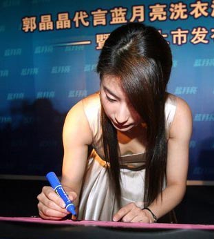 2008年11月24日,奥运跳水冠军郭晶晶作为代言人出席某洗衣液品牌在北京举行的新产品发布活动。虽然北京天气比较寒冷,但郭晶晶还是相当有敬业精神地穿上性感露肩金色连衣裙彰显贵气。不过,郭晶晶身穿低胸连衣裙俯身在嘉宾名册上签名的时候竟然不慎走光,娇美的乳沟在兰色内衣的点缀下显得相当性感。