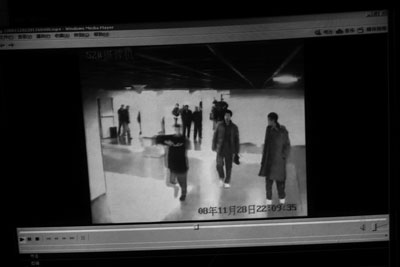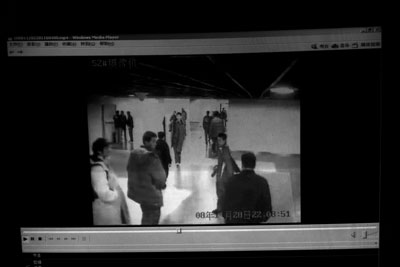 22点07分 刘炜第一个从客队休息室出来,径直向摄像头方向走来,他的身后陆续跟出了蔡亮等7到8个上海队队员,刘炜(注:当时刘炜第一个走出了摄像头的监控范围)张望一会后,便返回了客队休息室,跟刘炜出来的队员也往回撤了一段距离,刚好正正的站在摄像头下面。