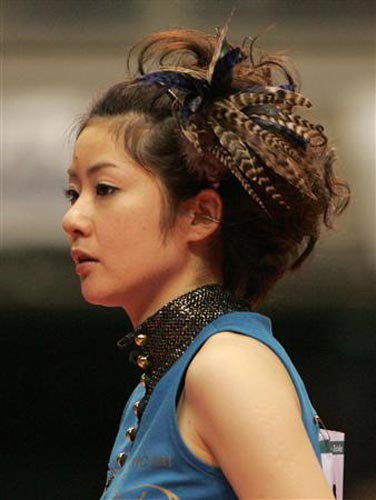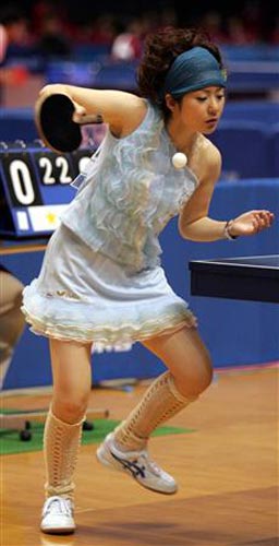 在日本乒坛,福原爱名声最大,其次就是有着漂亮脸蛋、性感身材的四元奈生美了。今年30岁的四元在日本的影响并不比福原爱低多少。从2007年的全日本乒乓球锦标赛至今,这位美女球员每次比赛都会换上不同的时尚超短裙,或是露出香肩的吊带衫参赛。而且,她的头饰也都是经过发型师精心设计的,爆炸式、淑女式……总之,五颜六色的服装+各类怪异的发型+比赛场上挥拍动作都是那么的迷人,相比于其他运动员的一脸严肃,四元奈生美在赛场上刮起的时尚之风迷倒了很多日本男球迷。