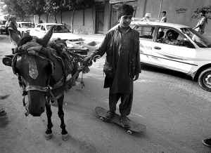 六个孩子在街头公园里玩滑板,翻着跟头,不停地笑着,看起来和世界任何一个城市的孩子一样,但这里是喀布尔,阿富汗。就在离他们二十几米以外,有辆被炸毁的汽车还躺在一摊刺眼的血迹旁,一个多小时前,这里刚刚发生了一起汽车炸弹爆炸事件。