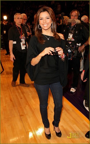 我们的绝望主妇伊娃·朗格利亚看来也是篮球迷啊,在NBA全明星赛的赛场看到了身穿黑色蝙蝠衫的伊娃·朗格利亚,性感的露肩款,配上紧身牛仔裤,高跟鞋,闪亮的大耳环熠熠生辉,连NBA的球星都争着和她合影留念。