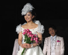 中新网2月18日电 据共同社报道,北京奥运羽毛球女双“潮田/小椋”组合中的一员、日本羽毛球名将潮田玲子17日在东京举行的著名设计师桂由美婚纱秀上担任模特,首次走上了T型台。