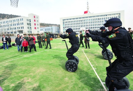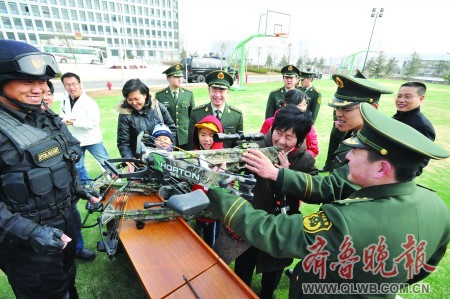 “呀!这是什么?”很多读者不清楚旁边两个轮子的车的功能。“这是割草机!”8岁的李雨琦自以为很懂,却不知道自己的话引得大家哈哈大笑。“这可不是割草机,这叫‘单兵突击车’!”陈队长摸着小雨琦的头告诉大家:“这个东西都是从美国进口,每辆1万美元!”随后,三名武警队员给读者演示了驾驶单兵突击车执行任务。