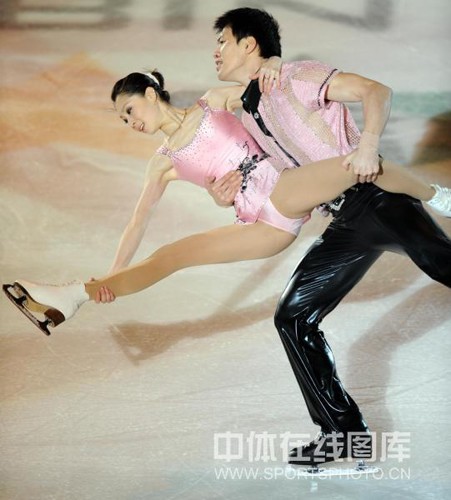 2009年2月25日,为答谢观众,获得第24届世界大学生冬季运动会花样滑比赛前三名的选手,在哈尔滨国际会展中心体育馆进行表演。图为获得双人滑冠军的中国选手张丹/张昊激情演出。(中体在线图片 白宇 摄)